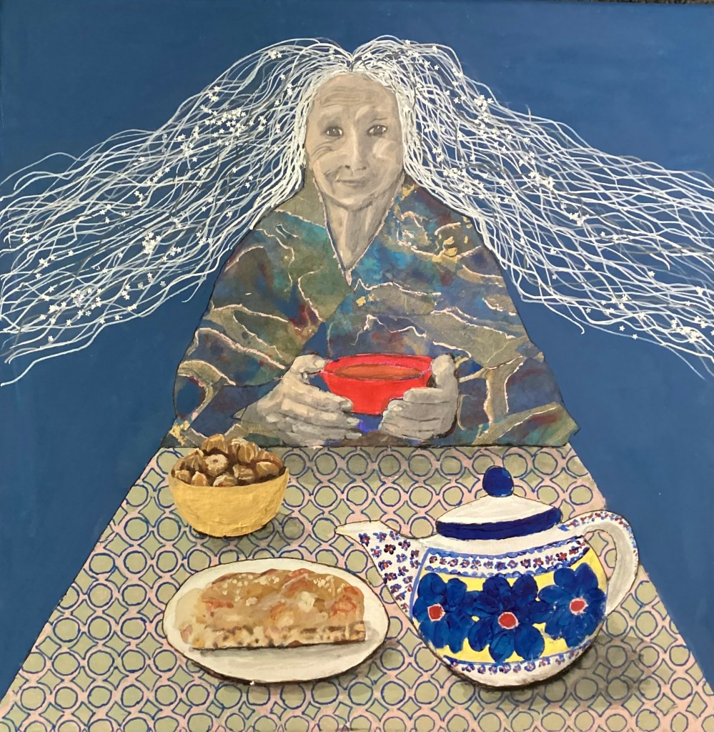 During March and April it is cold one day and warm the next or it is near freezing in the morning and 80 degrees by afternoon, the time of year when the old and the new converge. This series of paintings begins with one that expresses my feelings about living in this early spring in these chaotic times–exhaustion. I am this poor lady nodding off in her chair, too tired to make it to her bed, remembering what it was like when the news cycle was finite and truth didn’t depend on the mood of the speaker.