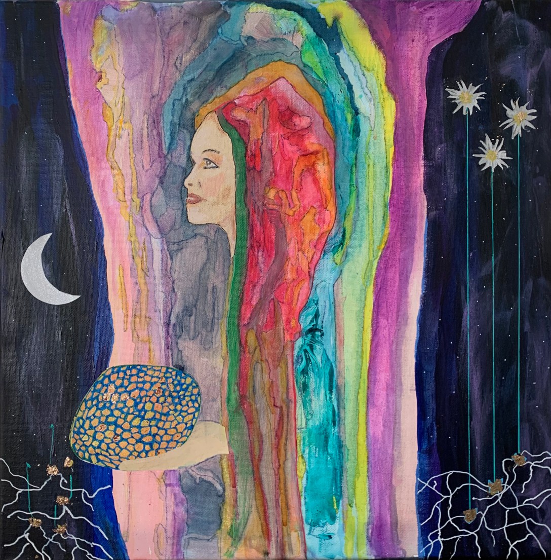 ‘Tis the season…of darkness and waiting but not of desolation. There is a richness in this darkness which gestates the brightness of hope. This painting is about planting seeds of love deep in the earth to rise into the heaven to become stars that light the path to the archetype of the Divine Child, Jesus, yes, but also new life in all its forms, the creative sparks from the unconscious that implant in the womb of mind to become a painting, a poem, a new idea, a vision of peace.